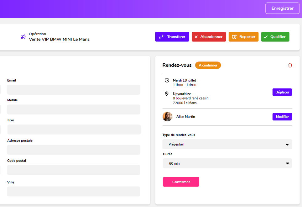 Vous pouvez transférer, abandonner, reporter ou qualifier à tout moment sur votre page "Détail du lead"