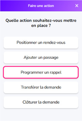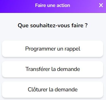 En cliquant sur "Faire une action", vous pouvez réaliser les mêmes actions que sur votre interface web : programmer un rappel, transférer la demande et clôturer la demande.