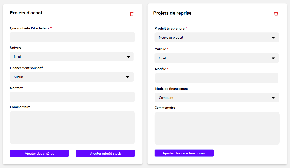 Selon les paramètres de l'opération, vous aurez la possibilité de remplir le projet d'achat ainsi que le projet de reprise.