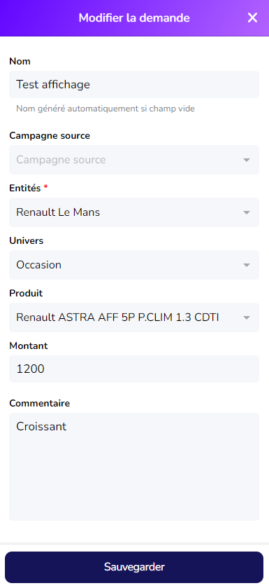 Vous aurez la possibilité de modifier les informations suivantes : nom de la demande, la campagne source, les entités concernées, l'univers, l'intérêt pour un véhicule, le montant total et un commentaire.